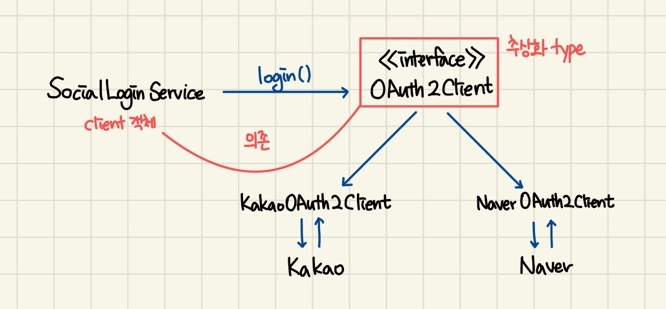 SocialLoginService가 KakaoOAuth2Client를 모르게 만들 것. → 더 높은 수준의 캡슐화, 더 낮은 결합도!
